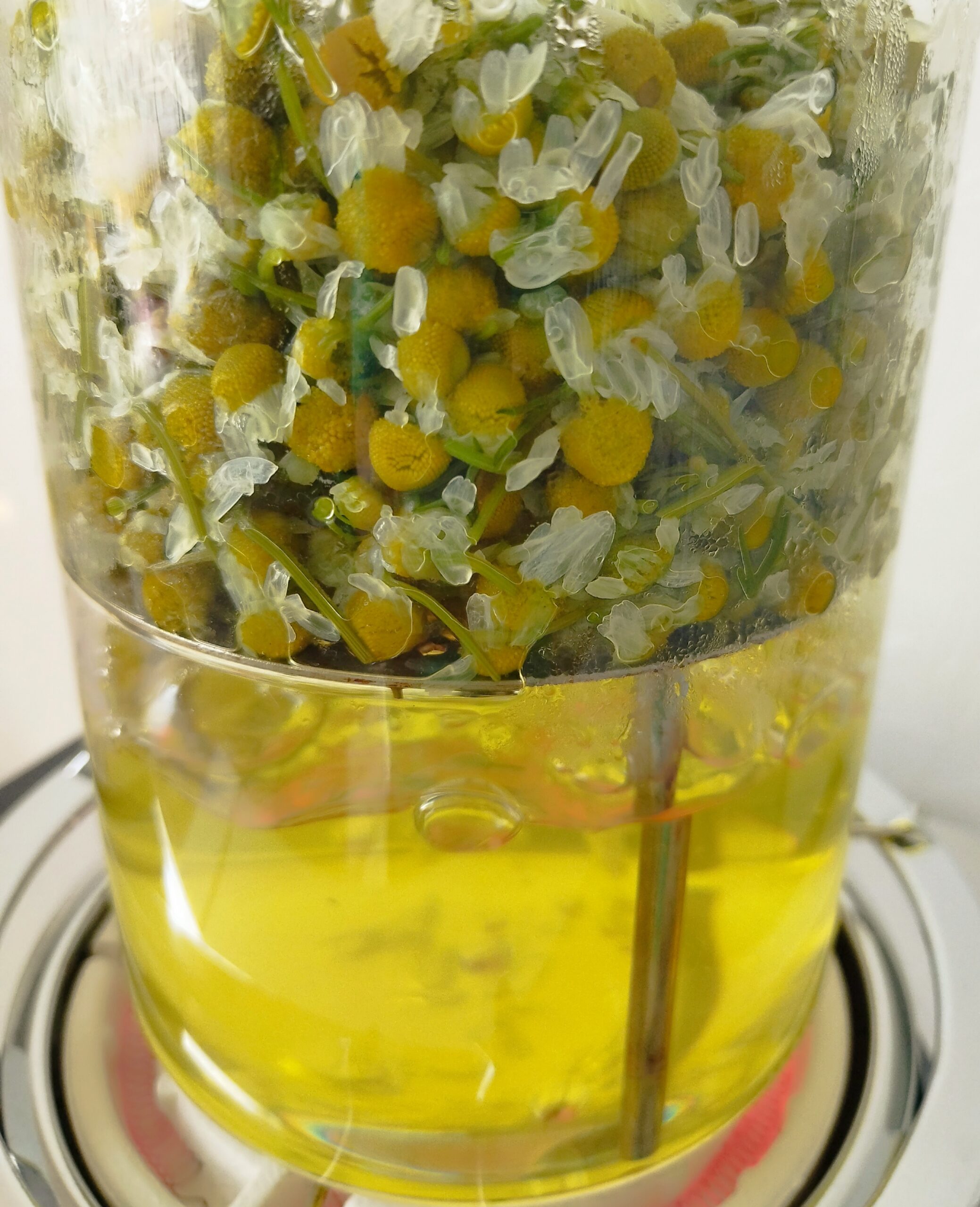カモマイルジャーマンの黄色い部分には、とっても細かな花粉が大量についています。作業しているとちょっとむせるような感じになったり、今回は気管あたりに違和感を感じました。キク科のアレルギーは持っていないはずだけど、大量に吸っては良くないなと体感しました。「天然だから安全」は、植物でも精油でも通用しませんね🌿