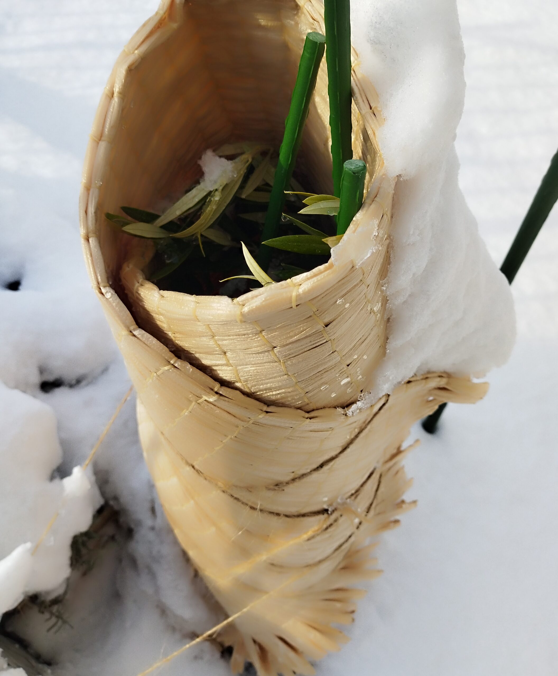 初めて越冬を試みているオリーブの木。雪の重みで枝が折れないように雪囲いを施し、寒さから守っていますが、無事に春を迎えられるでしょうか。