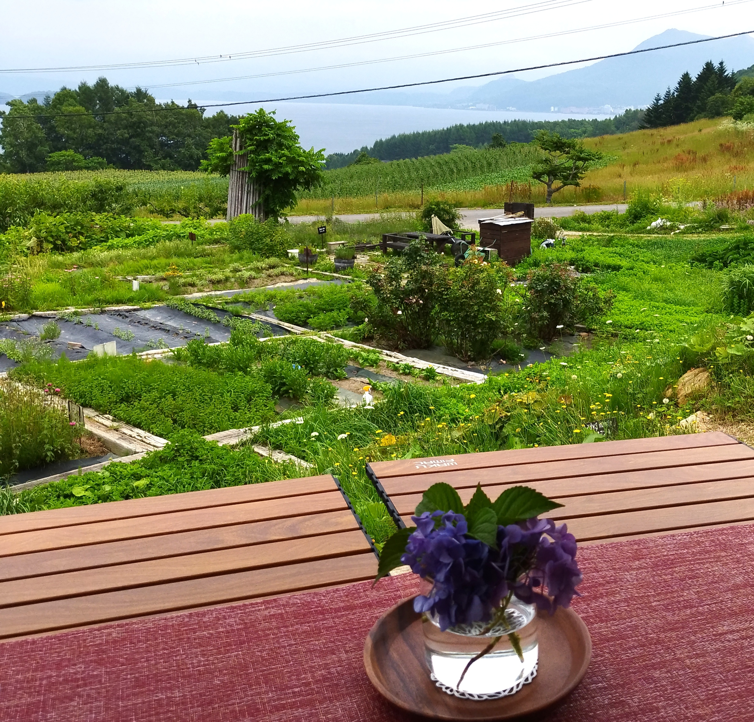 テラスからは洞爺湖を望むことができ、たくさんのハーブが植えられた畑の広がる素敵な場所でした。