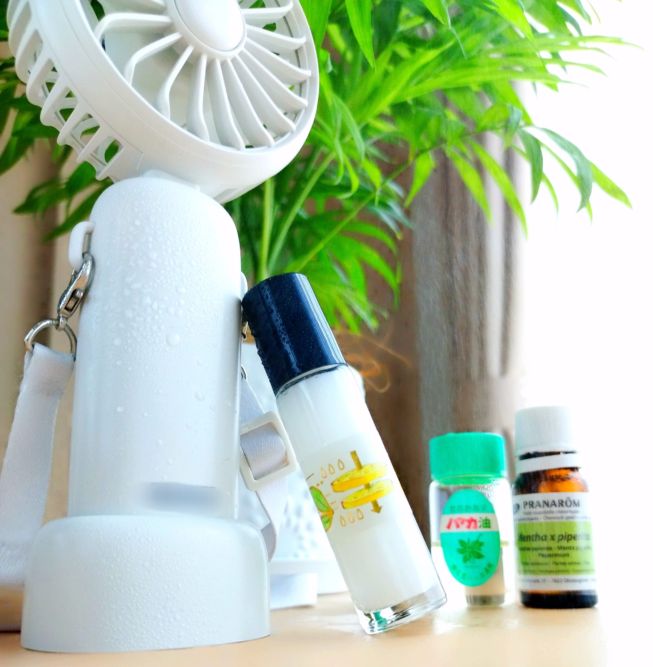 液体の乳化剤数滴にペパーミントとハッカの精油を一滴ずつ加えて、ペパーミントのハーブウォーターを加えて混ぜたら完成です。これを塗って扇風機に当たると結構冷えた感じがします。