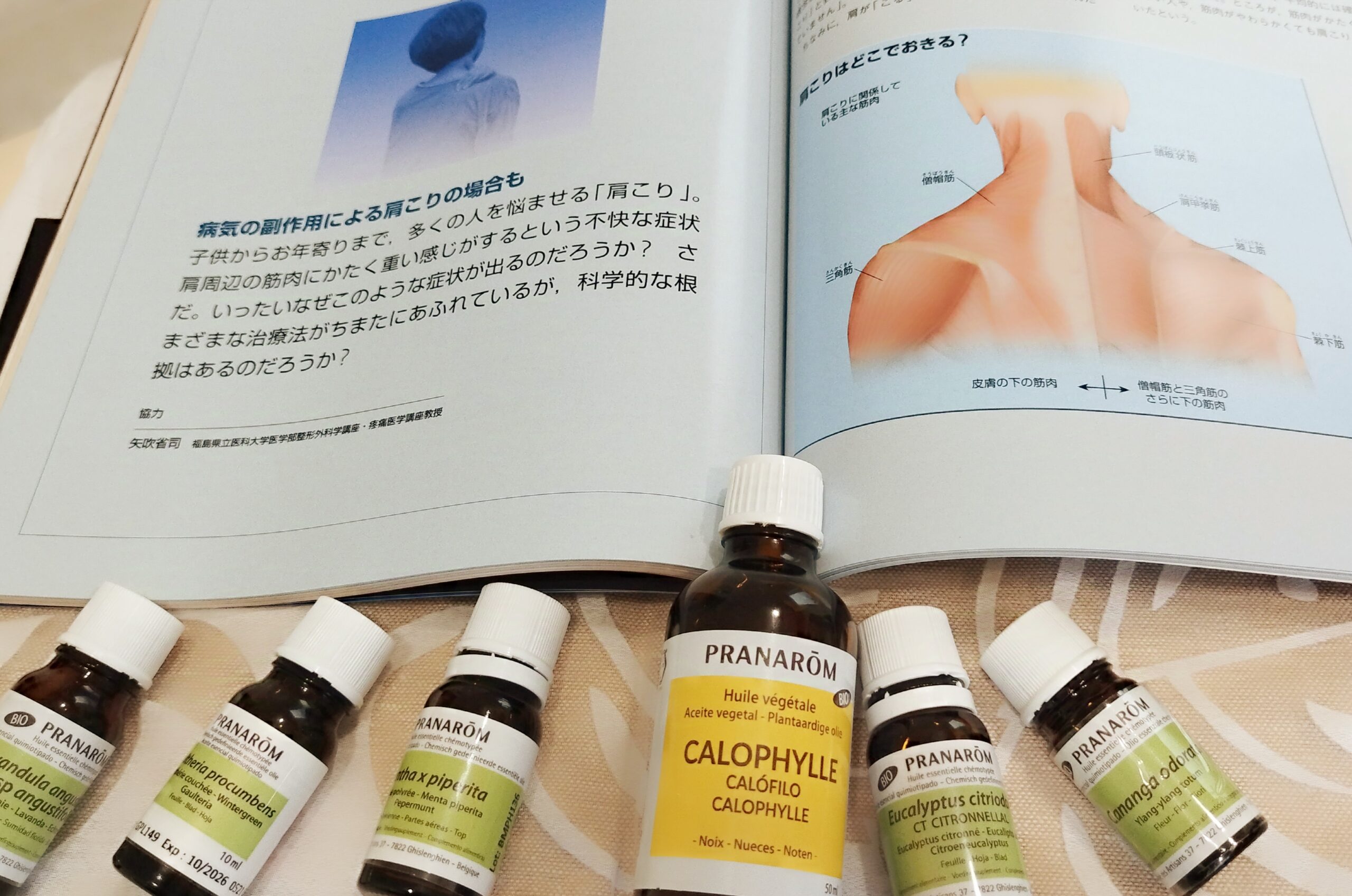 ナード・アロマテラピー協会のアロマ・アドバイザーコースのレッスン9では、肩こりをはじめとした筋肉の痛みに有効な精油について色々と学びます。