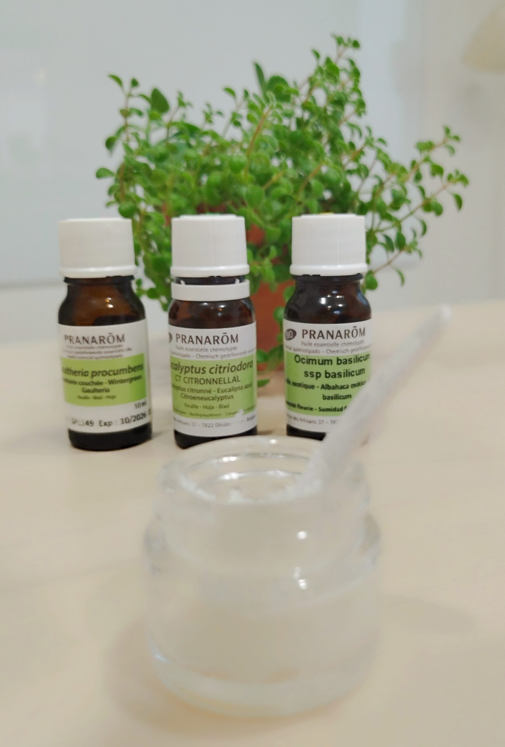 湿布のような香りが特徴のウィンターグリーン、レモンのような爽やかさの中に力強さがあるユーカリレモン、そして筋肉の緊張を和らげるのが得意なバジル。